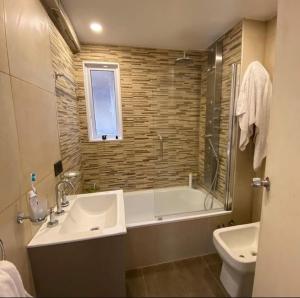 Accommodation consists of two bedrooms complemented by a fully equipped kitchen including both kitchenette facilities and a full kitchen for cooking needs. The unit also features one bathroom complete with an in-room hot tub for added relaxation, as well as heating, air conditioning, and a washing machine to enhance guest comfort.