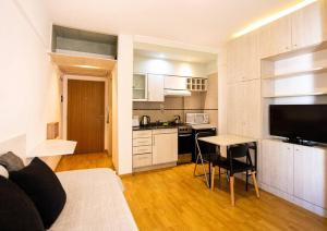 Accommodation consists of one bedroom with air conditioning and heating plus one bathroom fitted with a bidet, hairdryer, body soap, shampoo, conditioner, and toilet facilities. The kitchen is fully equipped with a stovetop, oven, microwave, refrigerator as well as coffee machine and electric kettle for added convenience. Guests will find additional in-room amenities such as an iron, work desk, non-feather synthetic pillows, bed linen and towels to ensure comfort during their stay.