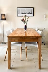This air-conditioned apartment comprises one bedroom with two beds, a living room with a sofa bed, and one bathroom equipped with a bathtub, shower, bidet, hairdryer, and toiletries. The kitchenette features an oven, stovetop, microwave, refrigerator, toaster, electric kettle along with kitchenware and a dining table for meals. Additional in-room amenities include heating options individually controlled per room as well as an iron with ironing board.