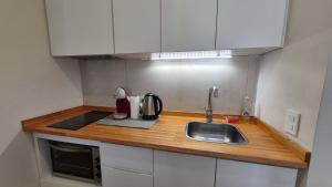 This air-conditioned studio includes a private bathroom with hairdryer, conditioner, and shampoo alongside ironing facilities such as an iron and ironing board. Guests can enjoy modern conveniences like a washing machine, wardrobe, towels, bed linen, heating and television all within the single-room layout. The kitchen features full amenities including an oven, microwave, kitchenware, electric kettle and tea and coffee making facilities with a dining table for added comfort.