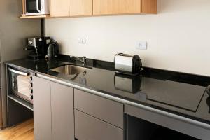 Each air-conditioned unit includes one living room, one separate bedroom, and a private bathroom equipped with a bathtub and complimentary toiletries such as body soap, shampoo, conditioner and more. The kitchens are fully outfitted with an oven, stovetop, refrigerator, microwave toaster coffee machine and electric kettle alongside kitchenware and dining tables for convenient meal preparation. Rooms also feature flat-screen TVs with streaming services as well as seating areas that include sofas or sofa beds.