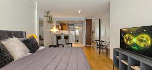The accommodation comprises one bedroom furnished with a single bed alongside a fully equipped kitchen featuring an oven, microwave, refrigerator, coffee machine, toaster, electric kettle as well as kitchenware. The bathroom comes complete with a bathtub or shower option including body soap and complimentary toiletries. Additional room amenities consist of individually controlled air conditioning, heating, hardwood flooring, an iron with ironing board plus trouser press, safe deposit box, wardrobe space and washing machine.